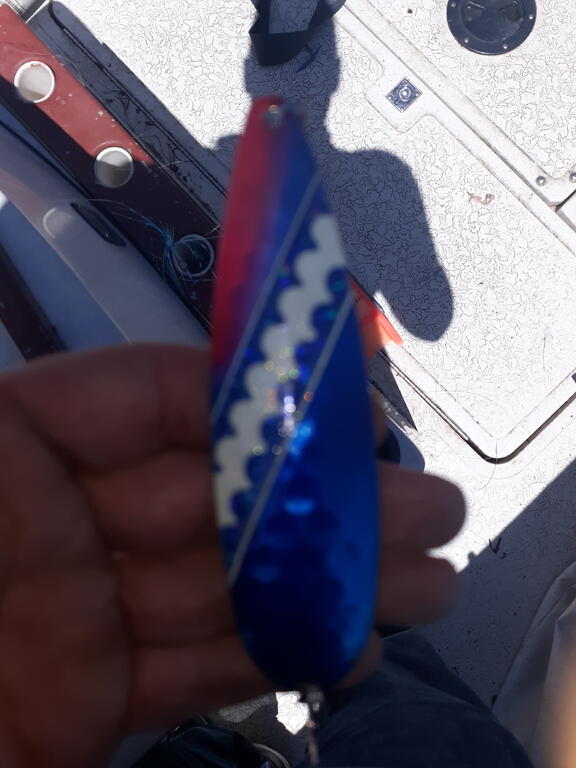 We mostly worked 118-125. 4-6. Broke off a nice fish on 200 copper HOLO frozen. Took one King on a 300 copper blue whale. Lost a big laker on a rigger white spin doctor and a homemade blue UV fly deep rigger. Other 3 fish came on blue spoons of the riggers. Set at 63 down and  2 came on the fixed slider 33 down. Took a friends 8 year old out put him on his first 2 silver fish. And tried to get him on the laker. He fought it for a while without gaining anything.