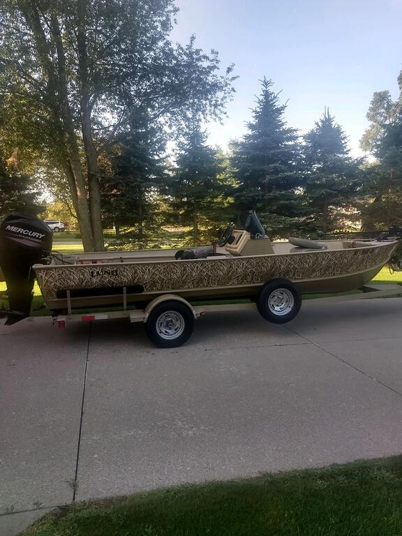 2010 Posted August 19, 2019 Posted August 19, 2019 1999 - One owner, 18.5ft Lund Alaskan with a 2017 60hp Mercury 4-stroke. Excellent condition. Always stored under cover. Includes Cabelas duck blind. Boat has camo wrap exterior and camo vinyl floor. Includes 2 travel covers, a Bimini top and Minn-Kota trolling motor. Trailmaster trailer in excellent condition with new tires including spare. Zercon fish-finder. Ready for fishing and duck hunting. Call 616-648-8 nine one nine. $15,200.00 Cash only please.