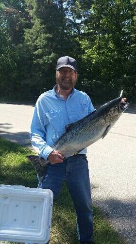 reel business Posted August 25, 2019 Posted August 25, 2019 When I looked back and saw my rod tip go up, I noticed my line wasn't behind the boat but far to the outside of my 230 cu. So I carefully maneuvered the fish under the cu rod line which was further back. The fish still caught half of the copper line and I had a little bit of a tangle in my net which I cleared once I got the fish on board. The hook fell out of her mouth when she hit the deck. When I netted the fish I used the transom as a fulcrum for balance until I could get better handle on it to pull the fish in.Sent from my SAMSUNG-SM-G900A using Great Lakes Fisherman Mobile App Nice King...we were finishing cleaning our fish as you showed up at the fish cleaning station...we caught a 22# King that morning 33 down off a down rigger on a Moonshine Magnum Flounder Pounder Sent from my iPhone using Great Lakes Fisherman Mobile App 2