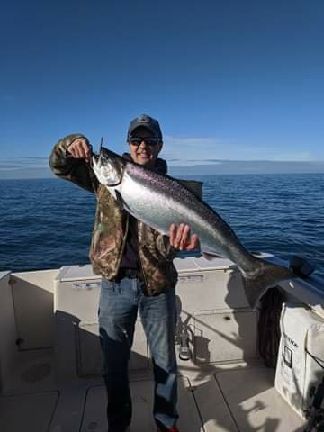 Mega Byte Posted May 21, 2020 Posted May 21, 2020 1st trip to Holland. Launched at the DNR launch on the NW end of the lake. You need boots to get to the dock. We get launched about 6:20 and I quickly realized I left the net at home. I have no idea why I took it out of the boat. I usually don't do that. We motored out, but had some boat issues and couldn't get it up on plane. We slow walked it out to the big lake. Lots of boats right out front so we set up early in 35 FOW on a NW troll. Picked up a 14# king in 48 FOW just before putting a board on a 200 Cu with a blue/green Captain Chuck's custom spoon (mag size). We decided to keep heading west. To make a long story short, here's that got hit: 105 FOW. W. Green Jeans RV. 10# laker 300 Cu112 FOW. N. 8" silver/green paddle and green fly. Braid slide diver w/ring out 157' on 3 setting.120 FOW. W. NBK mag spoon. 10# king. Braid slide diver w/ring out 150' on 3 setting.130 FOW. N. Stinky White Leroy paddle & meat. 19# king. Mag dipsy diver on wire out 130' on a 1.5 setting. 154 FOW. W. Dancing Anchovy spoon. 250 Cu. (Missed it.)160 FOW. NW. Kevin's Girlfriend Spin doctor meat rig. 10# king. Rigger down 54'. 160 FOW. NW. Big silver pro-troll paddle and double aqua Howie fly. 8# king. (Double header.) This fish came up from 100' deep to investigate. I dropped the cannonball and it hit before it fell 8 feet.130 FOW. E. Stinky White Leroy paddle & meat. (Miss - off before we could grab the rod.) Mag dipsy diver on wire out 173' on a 1.5 setting.117 FOW. N. Kevin's Girlfriend Spin doctor meat rig. 20# king. Rigger down 54'. Every fish that made it to the back of the boat we got in. We took our time and tired them out. I got on the swim platform and as we brought them up to the boat, I use the fish Grabber to hook them under the gills and swing them into the boat through the tuna door that leads to the swim platform. Enjoy the pics: This was a fun trip. I got to take my brother, his pastor and son out. We made it back in, and got the prop issue fixed for $23. I'll be back out tomorrow morning. Sent from my LG-Q710AL using Great Lakes Fisherman Mobile App 5