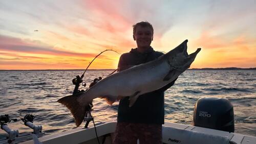 2MD Posted August 2, 2020 Posted August 2, 2020 Wilson and I were rewarded for getting up early and out before sunrise off of Holland Saturday morning. Ended up 4 for 6 Had a double setting lines in 80fow at around 6am (full core Yellow Dolphin while being set… the board had just been clipped on and we were letting it out when it went – managed to land our biggest chinook of the morning and year thus far) (high dipsey blue spindoctor & fly while still letting line out with only 60 feet out – landed a 2 year old chinook) From here we took a 3yr old chinook next in 90fow at sunrise 6.30am (high dipsey blue/green spindoctor with 140foot of line out) Then we missed a couple big hits on the downrigger (55 down moonshine mag flounder pounder got smoked twice but just didn’t stay hooked) Last we got another big chinook in 98fow at around 8am (deep dipsey with 100ft out green frog spindoctor and white fly) The east wind was howling and most guys left the shallower water so quickly… for us sticking around and little more in tight really worked out. This north wind brought the temp break up higher which was great to see. Was going to keep the boat on anchor overnight here in west olive like we have commonly done so we could fish again Sunday morning but the weather changed and the north wind started whipping so we changed our plans… 8