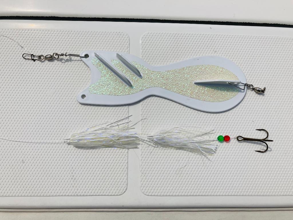 zgrinder on Fin Warrior Posted August 6, 2021 Author Posted August 6, 2021 As promised, a pic of the 9" spin doctor and double skirted howie white crinkle fly with the size 2 Mustad hook. The skirts are separated for the pic but they lay simply one on top of the other. I run double skirt flies in the fall for the same reason I move to magnum spoons - bigger bait profile. It helps to trim off some of the tube from the underside of the fly skirt with a box cutter to get a tighter overlay. Probably should have put a coin next the hook to help with visualizing the size. Lead is 22" from the connecting loop to the very top of the first fly skirt. There is enough hardware hanging from the back of the spin doctor that justifies the shorter fly leader. 1