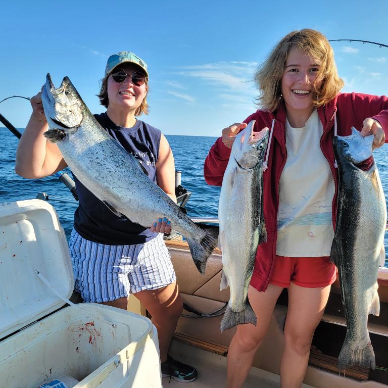 EdB Posted August 17, 2021 Posted August 17, 2021 The offshore bite has been good for us. We have been fishing 350 and out to 450 fow, about 12 miles out. Got 10 each trip fishing the morning, we pulled lines at 10:30 today. Fast action losing more fish than we should but had cohos and jumping steelies in the mix. Bites have been on riggers down 80 and 100 with a double stack with a mag Moonshine carbon 14 with a regular MS carbon 14 10 ft above it and a double stack of mag and regular Moonshine sarge on the other rigger. A 10 inch Dreamweaver white slick spin doctor and pickled sunshine fly on a low diver out 150 to 170 and on a 450 copper has been taking a lot of hits. A 8in green bikini DW spin doctor and green crinkle spin doctor with the same pickled sunshine fly on high divers out 225 have been good. Dreamweaver SS rasta goose, double orange crush and fireball on 225 and 300 coppers were taking bites. Looking forward to next few days, the water is stable today. 3