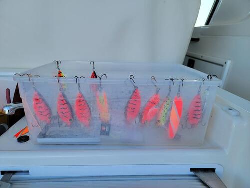 EdB Posted March 21, 2022 Posted March 21, 2022 First troll of the year was good for us. Set up in 20 FOW and went on a south troll. We ran thin fins on boards staggered with 50 to 80 ft leads. Stinger orange spoons on divers out 15 ft. Fast action we trolled less than a mile and had 11, turned around and got our 20 in another half mile. Got into 7-8 fow, shallow was good. Good luck! 7