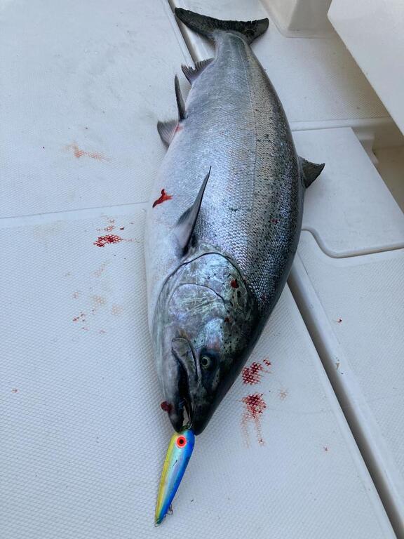 zgrinder on Fin Warrior Posted June 11, 2022 Posted June 11, 2022 Put lines down about 4:30PM in 130FOW just north of the harbor on a NW troll. Same marks around 120' down on previous trips showed up and we put SW down in that area with Blue Tuxedo but no action to speak of. Trolled a few passes around 140' to 170'FOW but no action and few marks. Made it north to 42o 50' but no action. Went out to 220 FOW but no action. Picked up a few shakers along the way and did our best to let them grow big. Shakers on the downriggers and long lines were a problem. We stopped counting after releasing 9. About 7:45 we took a small king on the UV Green Dolphin stud from previous outings and kept it for a Saturday dinner. Clearing lines, swapping spoons and more shakers. The boat was about latitude wise in front of the harbor as the sun went behind the storm front to the west and we turned east toward the harbor to get ready to pull lines as nothing was happening and the chop was picking up. Both dipseys got hit right after the turn. Unfortunately the rig on myside of the boat took off on a long run whereas Brian my gest got a much less of a hit. Brian got his small king to the back of the boat and released, then netted the king I battled which came in at 17.5lbs. (the increased 7' to 9' leader on my dipseys is clearly a challenge in netting fish). He did a great job netting it but I wish he was on the rod instead of me. We parked those two rods and pulled the remaining 4 and each had a shaker on it - from 30' to 90' down in the water column. It was a battle to catch keeper fish while dragging shakers around all evening. But on the upside - NO FLIES . Data is a bit week below. # Time Fish FOW Latitude Troll Rod Bait Depth Bait 1 7:45 PM King 5lb 174 ? S Downrigger 41 Green Dolphin UV / MI Stinger 2 8:50 PM King 4lb 178 42o 47' 06" W Downrigger 50 Green Dolphin UV / MI Stinger 3 8:50 PM King 17.5lb 178 42o 47' 06" W Downrigger 50 Blue Dolphin / Pro King Foil The big king - great hook set on the high dipsey. Good hunting this weekend! 7