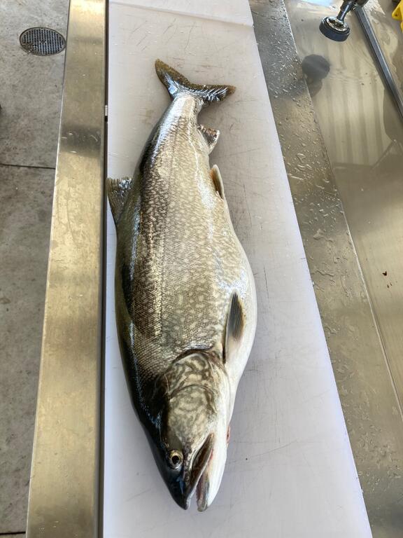 Steelie on 300 copper in 114’ on mag bl/gr/silv crippled alewife Gander Mtn spoon; laker on 150 copper on red pepper DW spoon in 140’.