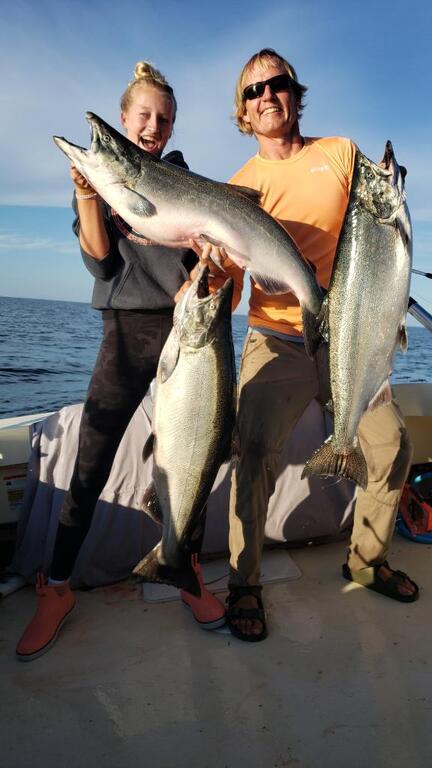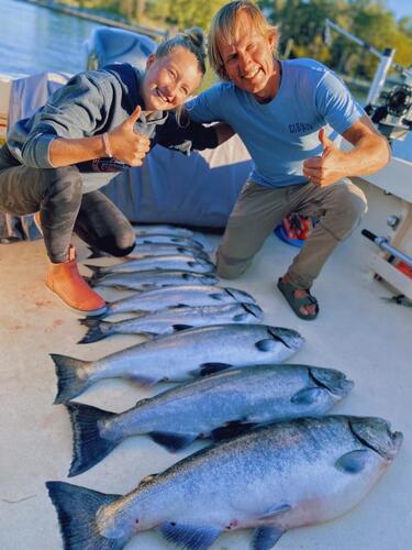 2MD Posted August 18, 2022 Posted August 18, 2022 had to give it another shot this Thursday morning so left the dock in Macatawa even earlier at 4.15am. what a dense,thick fog that was along the shore all morning! fortunately it cleared when we reached 50fow Same program as yesterday got em in the dark on a north troll in that 85-90fow pretty solidly in the pitch black... once sun rose then 105fow was magic went 10for11 5color moonshine happy meal 26# king rigger 54 down moonshine spoon deep diver 95 back went 4 times with coyote echip flasher fly rigger down 47 went dolphin spoon 10core went twice moonshine spoon MONSTERS 20# both time copper200 went once moonshine spoon what a morning! well over a hundred pounds in salmon caught had a great crew onboard - two triples and a double made it nuts! 6