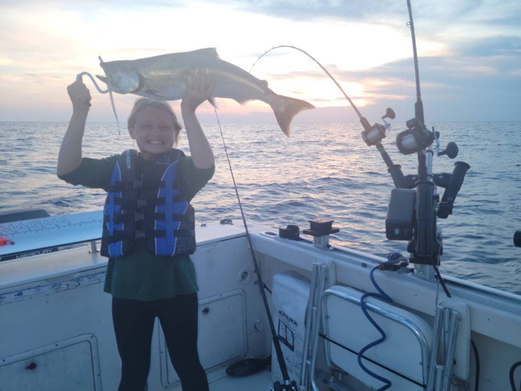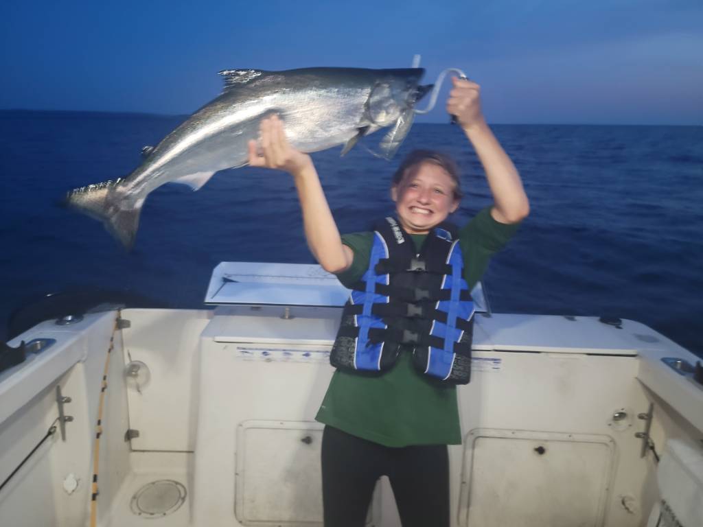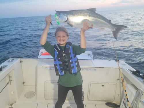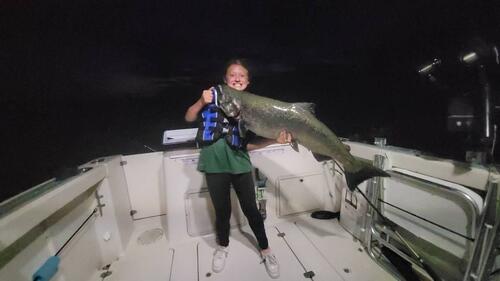 Mega Byte Posted August 25, 2022 Posted August 25, 2022 We did a late trip Wednesday night. We left the dock at 7 and had lines set by 8. We fished water 118 to 90 FOW on a NE troll. We finished with 2 young kings, a nice coho, and a 25# king. My daughter thought it would be fun to pose with the fish over her head tonight. The 250 Cu with a Mag Yeck Wartfrog fired at 8:20. We boated a nice Coho. At 8:38 the heavy wire slide diver out 120 with a green knight spoon took young king. We reset it, but this time only out 100 feet and 17 minutes later it fired again with another young king. Another 15 minutes went by (so around 9:15) and a 200 Cu with a glow Submarine spoon took our last fish of the night. It was a 25# king. This one she couldn't lift over her head. Then we pulled lines. Sent from my SM-G991U using Great Lakes Fisherman Mobile App 8