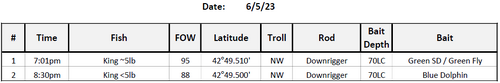 zgrinder on Fin Warrior Posted June 6, 2023 Posted June 6, 2023 Got out with Janet for an evening float and excited to put 6 rods in the water this trip. There were 2-3 other boats out and we all appeared to be working 90-120 FOW. We were paired with one North of the harbor. Chatted a little bit on the radio, it was slow for everyone. Went 2 for 2, both small kings. Kept the first for dinner tonight and let the second foul hooked one go. Tried running a ball right off the bottom with a SD/fly but got nothing but mussels. Cottonwood scum was fouling up the lines as well. Marked a number of bait balls inside 100 FOW with 40 degree water down 60 feet. With the lake being calm, cold water and little boat traffic, I would not expect the fish to be out in deep water but they did not show up inside of 150 FOW the last two trips. Data below. 4