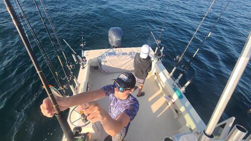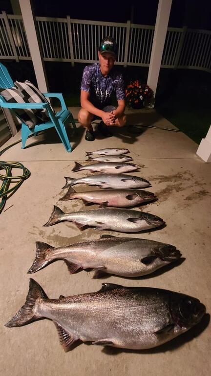 FBD Posted August 29, 2023 Posted August 29, 2023 Heard rumors kings were in close. Got out last night and sniffed out front, nothing going. Slid out until we hit cold water on the bottom and fired a double on both long lines. Sheep and a 7# king. Slid out a little deeper 225 copper digs in, 3# walleye. Got a little darker and things just went full stupid. Riggers and divers took over, at one point we had a fish on the floor, fish in the net, fish on the diver, and rigger fish through the seven color. Got that all sorted out only to have the last rod down fire just as we reached to pull it. Ended up 7/12 including the Lake Erie creatures. Two mature kings, two immature kings, and a football of a Master Angler coho. Boat is a disaster the rigger rod and 7 color are still all wrapped up in a ball. Leaders all need to be checked and swapped out to 30#, plug harnesses retied, drags backed down. 4 1