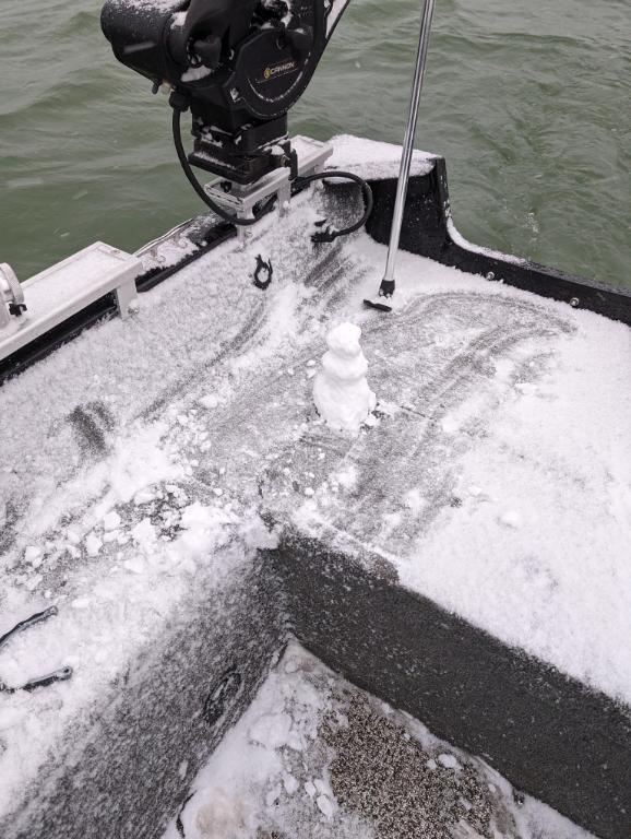 spieg Posted March 22, 2024 Posted March 22, 2024 After not having the boat ready in time for the nice weather a couple of weeks ago, I finally got on the water for the first time this year. Left port just before sunrise with pretty poor visibility from the dark and snow. Ran south and set up a half mile or so north of the chalet's on a south troll in about 20fow. Lots of marks all day long in 18-23fow. Water temps were 42-44f everywhere except near Cook, it was 47-49f there. Got my first fish near that chalet's, brown trout on a flatline pulling a red w black thin fish. Second fish came just as I was passing Cook, coho on a 1 color lead core pulling a red with yellow thin fish. Circled back to run by the plant again on a North troll, but didn't pick anything up. Made a snowman along the way to try to make the best of the snow. It's a good thing there weren't any other boats out there, I had a pile of snowballs ready to go! After trolling north about 1/4 mile past Cook, I looped back south to make another pass. Didn't pick anything up along the way this time and ended up going a half mile or so south of Cook and working into 15fow. Made a big loop out to the North again into 25fow or so. Angled back in to 20fow near the south buoy at Cook and picked up another brown trout on the red with black thin fish on the flat line. Kept working North as the winds started to pick up a bit and another snow storm started. Made a couple more snowmen to help ignore the cold. Picked up another coho in front of the dunes on the red with black thin fish on the flat line. Kept on trolling north from there zig zagging through 17-25 fow. Passed a couple of pilothouse boats on south trolls along the way and decided that my next boat needs some kind of cabin. Picked up another coho along the way on the red with yellow thin fish on a one color to fill the box. Ran a two color lead core all day with a red with black thin fish on it, but never had any action on that. Hoping to make it back out on Sunday if the waves cooperate. 5