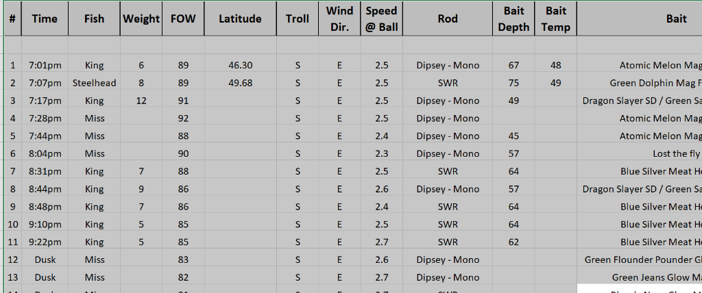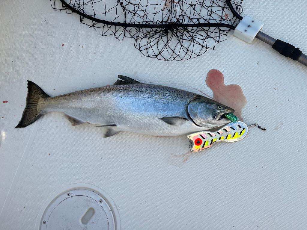 Ran a solo run tonight, 2 mono dipseys and SWR on the DR.  Set up north of the harbor in 90 FOW trolling north at about 6:00pm.  There was a lot of boat traffic in 120-140FOW so I decided to stay inside of all that fish pressure.  Ventured out to perhaps 110 FOW marking fish but no bites.  Turned around to a south troll about an hour later.  Had to deploy my trolling valves to get down to 2.5mph at the ball as the speed was quick.  From that point on it was steady action.  Dipseys with Atomic Melon mag spoon and a Dragon Slayer SD and green UV Salmon Candy fly saw a lot of action.  My deep rigger SWR rod with a green dolphin foil mag spoon surprisingly boated a steelhead but that was it.  Later in the run, I put meat down with only a blue/sliver bait head and got three hits.  Ran all the way to Saugy on the south troll with steady action but no really big kings.  Largest was 12lbs.  After dusk glow program did not produce a vicious bite but I got one in the net that was released.  For a 3 rod spread, it was a lot of fun tonight and hope to find some bigger kings next time out